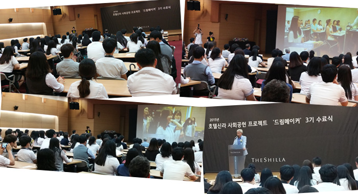 8월 13일(목) 충무아트홀 컨벤션센터(서울시 중구)에서 서울지역 고등학생 80명에 대한 ‘호텔신라 드림메이커 3기 수료식‘이 진행되었습니다. 이날 수료식에는 수료생과 학부모, 호텔신라 송성호 전무, 서울시 교육청 이재근 진로직업교육 과장, 나눔국민운동본부 등의 관계자들이 함께 하였습니다.
