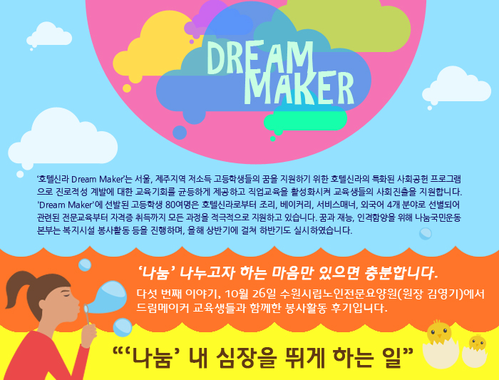 밝은 미소로 힘든 내색 하나 안하고 행복해하던 드림메이커 교육생들과 함께여서 우리 본부 직원들도 또 하나의 가을 추억을 만들었습니다. 오늘 하루도 다함께 외쳐볼게요. “화이팅”