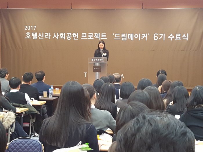호텔신라 사회공헌 프로젝트 드림메이커 수료식이 올해 6 번째 결실을 맺게 되었습니다. 지난 2월 15일(수) 충무아트홀 컨벤션센터(서울시 중구 소재)에서 '호텔신라 드림메이커'6기 수료식이 진행되었습니다. 수료식에는 많은 수료생들과 호텔신라 송성호 전무님, 서울시교육청 한상로 국장님, 나눔국민운동본부 정경희 사무국장님 등 많은 분들이 자리를 채워주셨습니다.