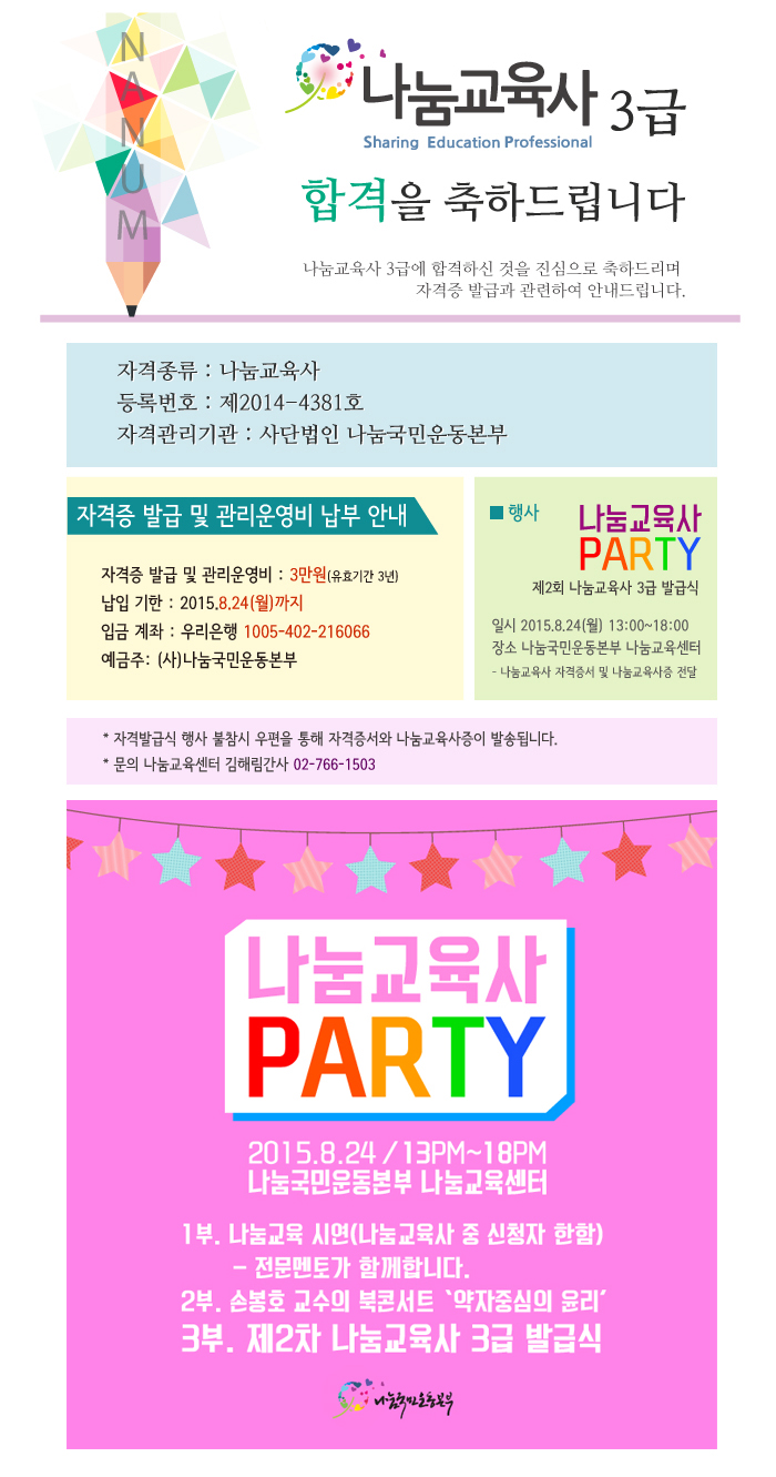 8월 24일(월) 13:00, 나눔교육사 3급 합격하신 분들과 함께 제2회 나눔교육사 3급 수료식을 개최합니다.